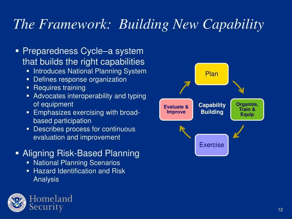 Preparedness Cycle–a system that builds the right capabilities Introduces National Planning System Defines response organization Requires training Advocates interoperability and typing of equipment Emphasizes exercising with broad-based participation Describes process for continuous evaluation and improvement Aligning Risk-Based Planning National Planning Scenarios Hazard Identification and Risk Analysis The Framework: Building New Capability Capability Building