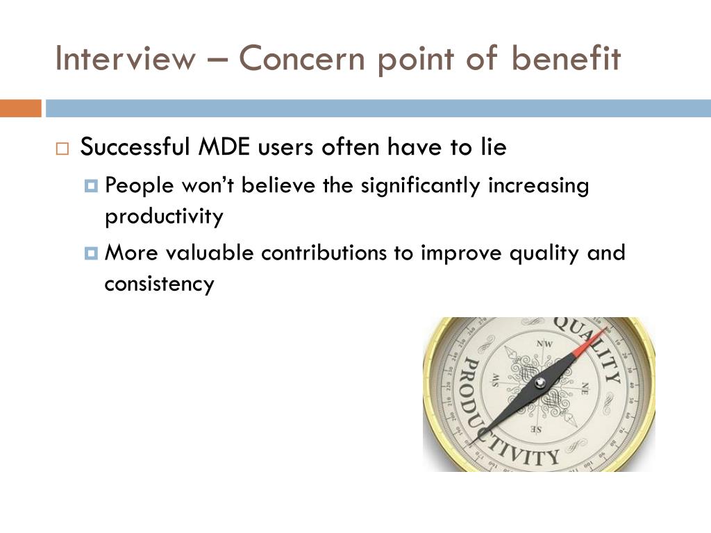 Interview – Concern point of benefit • Successful MDE users often have to lie • People won’t believe the significantly increasing productivity • More valuable contributions to improve quality and consistency