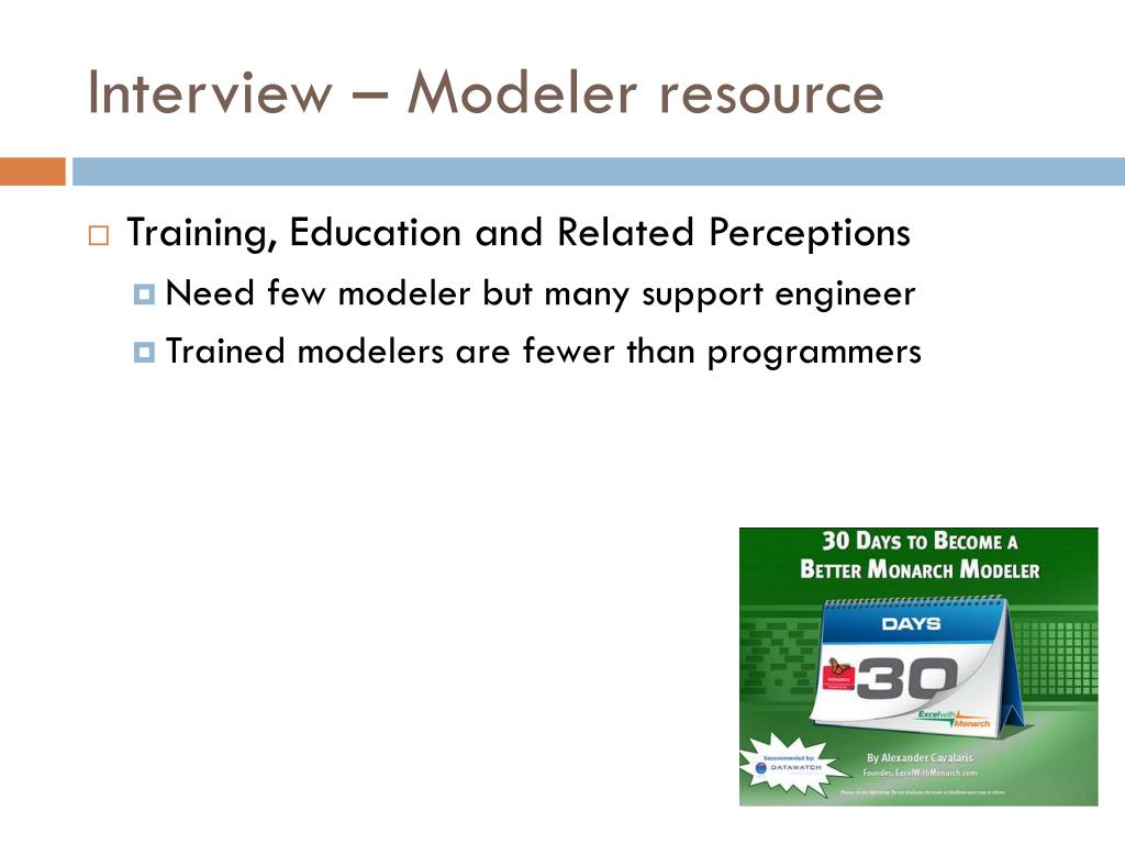 Interview – Modeler resource • Training, Education and Related Perceptions • Need few modeler but many support engineer • Trained modelers are fewer than programmers