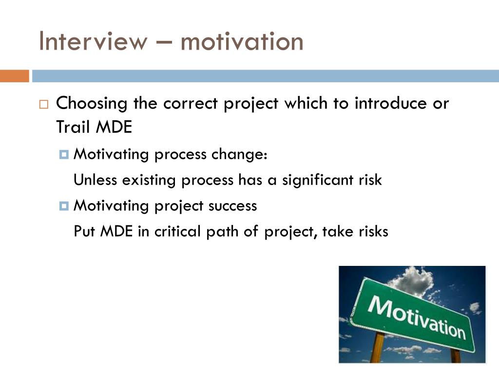 Interview – motivation • Choosing the correct project which to introduce or Trail MDE • Motivating process change: Unless existing process has a significant risk • Motivating project success Put MDE in critical path of project, take risks