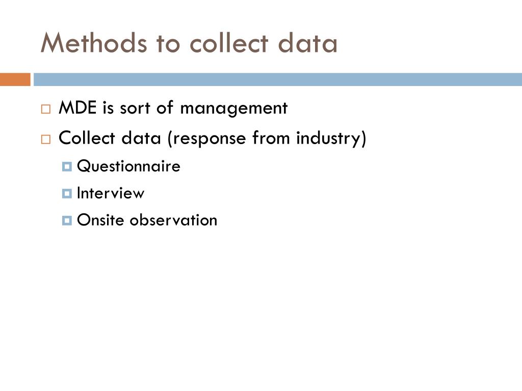 Methods to collect data • MDE is sort of management • Collect data (response from industry) • Questionnaire • Interview • Onsite observation