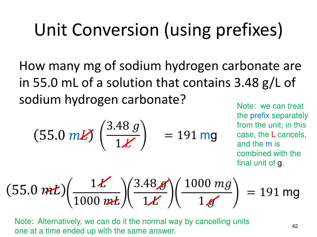 Unit Conversion (using prefixes) How many mg of sodium hydrogen carbonate are in 55.0 mL of a solution that contains 3.48 g/L of sodium hydrogen carbonate? Note: we can treat the prefix separately from the unit; in this case, the L cancels, and the m is combined with the final unit of g. Note: Alternatively, we can do it the normal way by cancelling units one at a time ended up with the same answer.