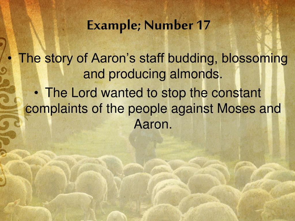 Example; Number 17 • The story of Aaron’s staff budding, blossoming and producing almonds. • The Lord wanted to stop the constant complaints of the people against Moses and Aaron.