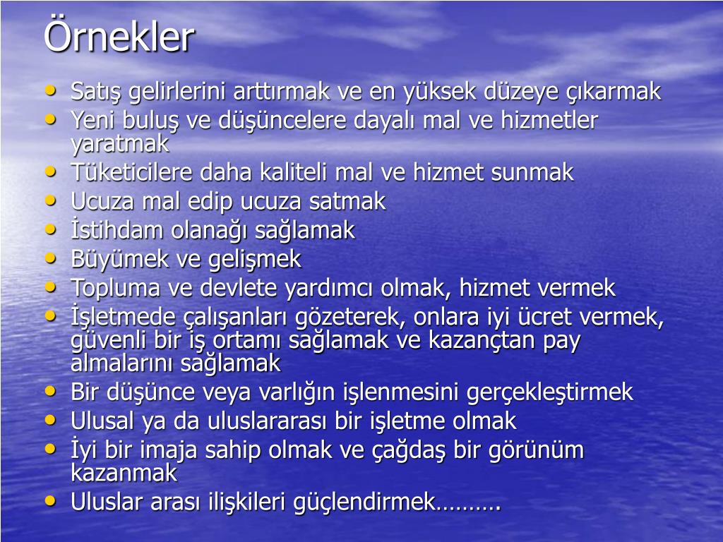 Örnekler • Satış gelirlerini arttırmak ve en yüksek düzeye çıkarmak • Yeni buluş ve düşüncelere dayalı mal ve hizmetler yaratmak • Tüketicilere daha kaliteli mal ve hizmet sunmak • Ucuza mal edip ucuza satmak • İstihdam olanağı sağlamak • Büyümek ve gelişmek • Topluma ve devlete yardımcı olmak, hizmet vermek • İşletmede çalışanları gözeterek, onlara iyi ücret vermek, güvenli bir iş ortamı sağlamak ve kazançtan pay almalarını sağlamak • Bir düşünce veya varlığın işlenmesini gerçekleştirmek • Ulusal ya da uluslararası bir işletme olmak • İyi bir imaja sahip olmak ve çağdaş bir görünüm kazanmak • Uluslar arası ilişkileri güçlendirmek……….