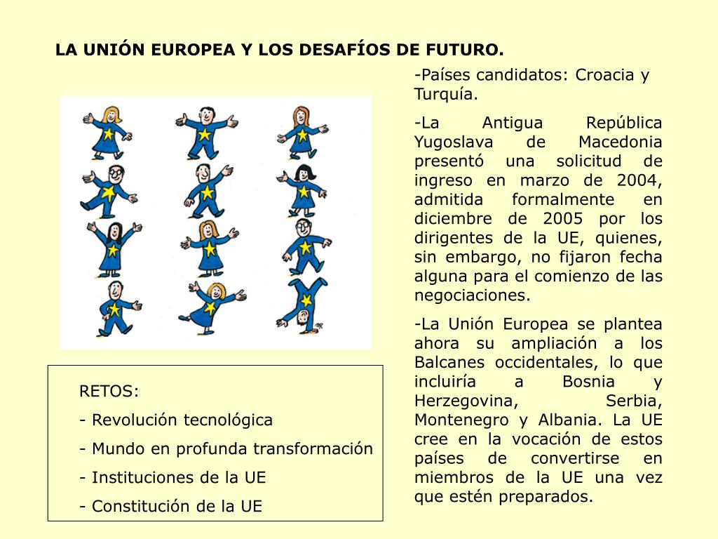 Países candidatos: Croacia y Turquía. • La Antigua República Yugoslava de Macedonia presentó una solicitud de ingreso en marzo de 2004, admitida formalmente en diciembre de 2005 por los dirigentes de la UE, quienes, sin embargo, no fijaron fecha alguna para el comienzo de las negociaciones. • La Unión Europea se plantea ahora su ampliación a los Balcanes occidentales, lo que incluiría a Bosnia y Herzegovina, Serbia, Montenegro y Albania. La UE cree en la vocación de estos países de convertirse en miembros de la UE una vez que estén preparados. LA UNIÓN EUROPEA Y LOS DESAFÍOS DE FUTURO. • RETOS: • Revolución tecnológica • Mundo en profunda transformación • Instituciones de la UE • Constitución de la UE