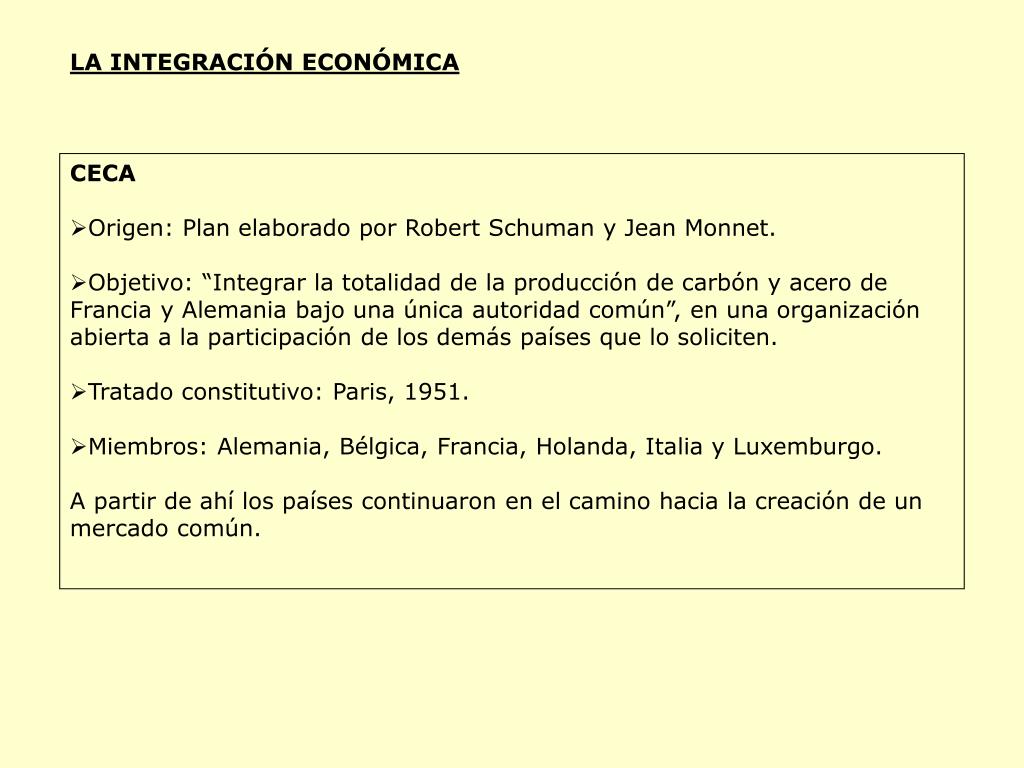 LA INTEGRACIÓN ECONÓMICA • CECA • Origen: Plan elaborado por Robert Schuman y Jean Monnet. • Objetivo: “Integrar la totalidad de la producción de carbón y acero de Francia y Alemania bajo una única autoridad común”, en una organización abierta a la participación de los demás países que lo soliciten. • Tratado constitutivo: Paris, 1951. • Miembros: Alemania, Bélgica, Francia, Holanda, Italia y Luxemburgo. • A partir de ahí los países continuaron en el camino hacia la creación de un mercado común.