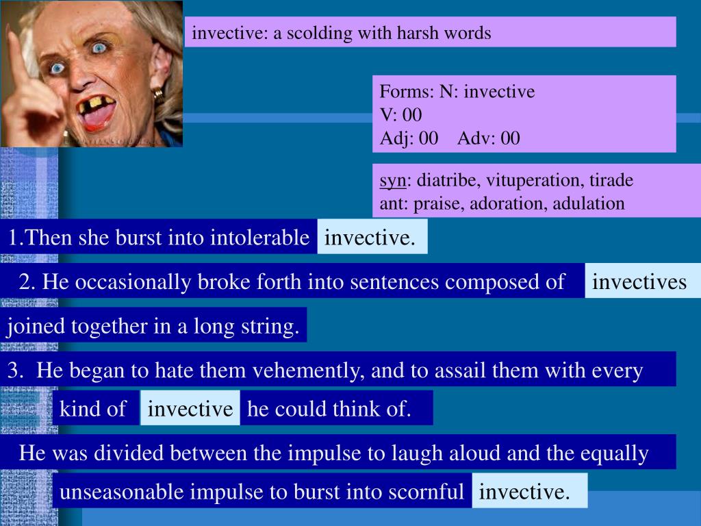 Forms: N: invective V: 00 Adj: 00 Adv: 00 syn: diatribe, vituperation, tirade ant: praise, adoration, adulation He was divided between the impulse to laugh aloud and the equally He began to hate them vehemently, and to assail them with every He occasionally broke forth into sentences composed of Then she burst into intolerable joined together in a long string. kind of unseasonable impulse to burst into scornful he could think of. Zen and the Art of Motorcycle Maintenance --Robert Pirsig Of Human Bondage --Somerset Maugham Maggie: A Girl of the Streets --Stephen Crane Middlemarch --George Elliot invective: a scolding with harsh words invective. invectives invective invective.