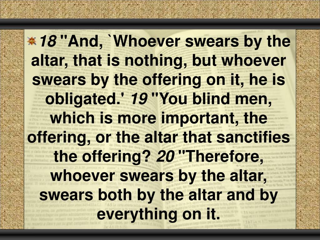 18 "And, `Whoever swears by the altar, that is nothing, but whoever swears by the offering on it, he is obligated.' 19 "You blind men, which is more important, the offering, or the altar that sanctifies the offering? 20 "Therefore, whoever swears by the altar, swears both by the altar and by everything on it.