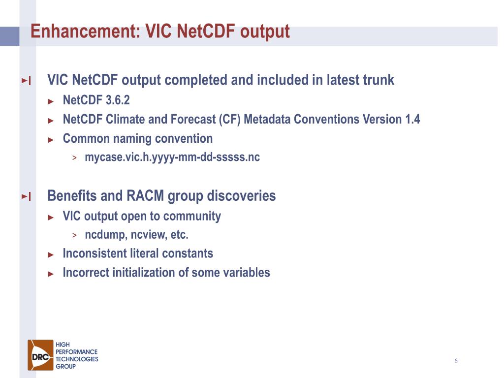 Enhancement: VIC NetCDF output • VIC NetCDF output completed and included in latest trunk • NetCDF 3.6.2 • NetCDF Climate and Forecast (CF) Metadata Conventions Version 1.4 • Common naming convention • mycase.vic.h.yyyy-mm-dd-sssss.nc • Benefits and RACM group discoveries • VIC output open to community • ncdump, ncview, etc. • Inconsistent literal constants • Incorrect initialization of some variables