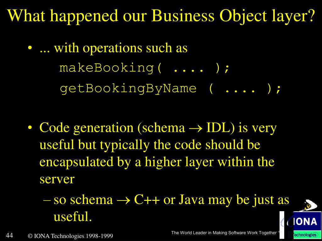 What happened our Business Object layer? • ... with operations such as makeBooking( .... ); getBookingByName ( .... ); • Code generation (schema IDL) is very useful but typically the code should be encapsulated by a higher layer within the server • so schema C++ or Java may be just as useful.