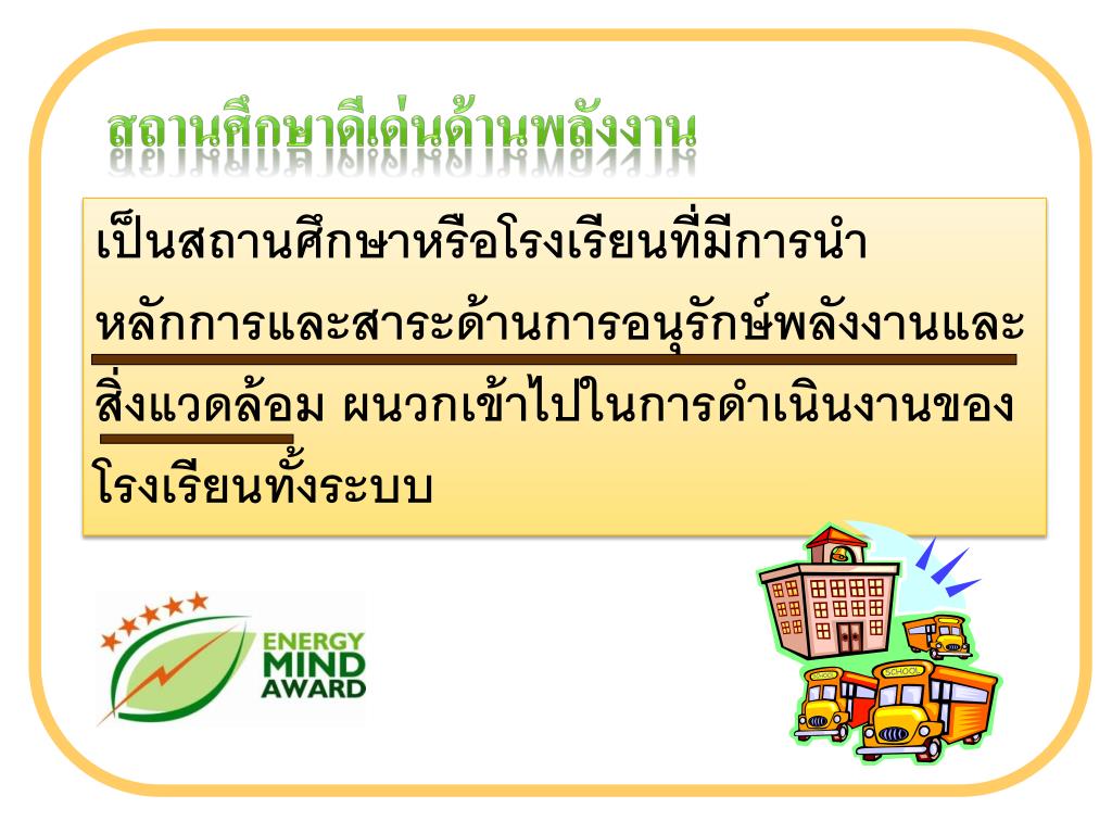 ดังนั้น สถานศึกษาดีเด่นด้านพลังงาน จึงหมายถึง โรงเรียนที่มีนโยบายด้านการอนุรักษ์พลังงานและสิ่งแวดล้อม โรงเรียนที่มีการจัดการ ด้านการใช้ทรัพยากร (พลังงาน น้ำ และผลิตภัณฑ์ต่างๆ) การป้องกันและจัดการมลพิษ (น้ำ อากาศ ขยะ) รวมทั้งมีการจัดสภาพภูมิทัศน์ และดูแลรักษาสิ่งแวดล้อมทั่วไป โรงเรียนที่มีการบูรณาการความรู้ด้านการอนุรักษ์พลังงานและสิ่งแวดล้อมในหลักสูตรและกระบวนการเรียนการสอน โรงเรียนที่การขยายผลการดำเนินงานด้านการอนุรักษ์พลังงานและสิ่งแวดล้อมสู่ โรงเรียนใกล้เคียง และชุมชน