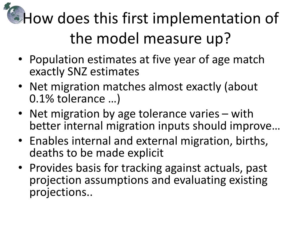 How does this first implementation of the model measure up? • Population estimates at five year of age match exactly SNZ estimates • Net migration matches almost exactly (about 0.1% tolerance …) • Net migration by age tolerance varies – with better internal migration inputs should improve… • Enables internal and external migration, births, deaths to be made explicit • Provides basis for tracking against actuals, past projection assumptions and evaluating existing projections..