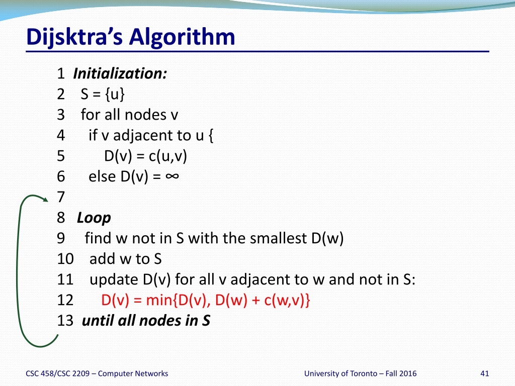 Dijsktra’s Algorithm 1 Initialization: 2 S = {u} 3 for all nodes v 4 if v adjacent to u { 5 D(v) = c(u,v) 6 else D(v) = ∞ 7 8 Loop 9 find w not in S with the smallest D(w) 10 add w to S 11 update D(v) for all v adjacent to w and not in S: 12 D(v) = min{D(v), D(w) + c(w,v)} 13 until all nodes in S University of Toronto – Fall 2016