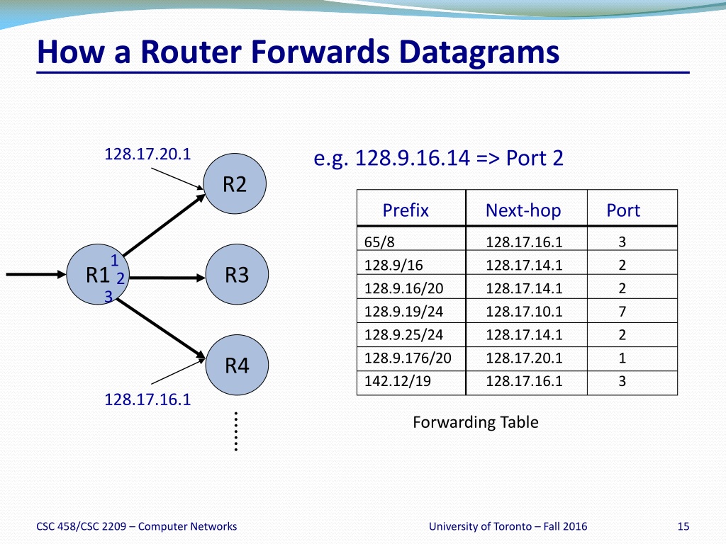 How a Router Forwards Datagrams 128.17.20.1 e.g. 128.9.16.14 => Port 2 R2 Prefix Next-hop Port 3 65/8 128.17.16.1 R1 R3 1 2 128.9/16 128.17.14.1 2 2 128.9.16/20 128.17.14.1 3 7 128.9.19/24 128.17.10.1 128.9.25/24 128.17.14.1 2 R4 128.9.176/20 128.17.20.1 1 142.12/19 128.17.16.1 3 128.17.16.1 Forwarding Table University of Toronto – Fall 2016
