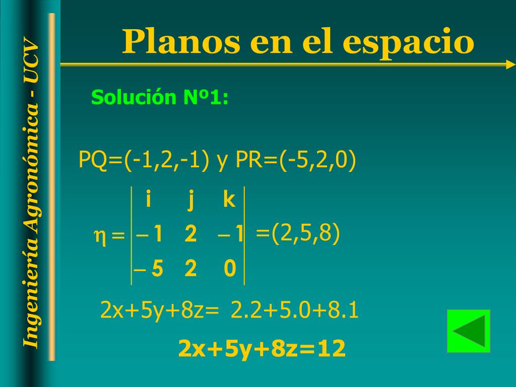 Solución Nº1: PQ=(-1,2,-1) y PR=(-5,2,0) =(2,5,8) 2x+5y+8z=2.2+5.0+8.1 2x+5y+8z=12