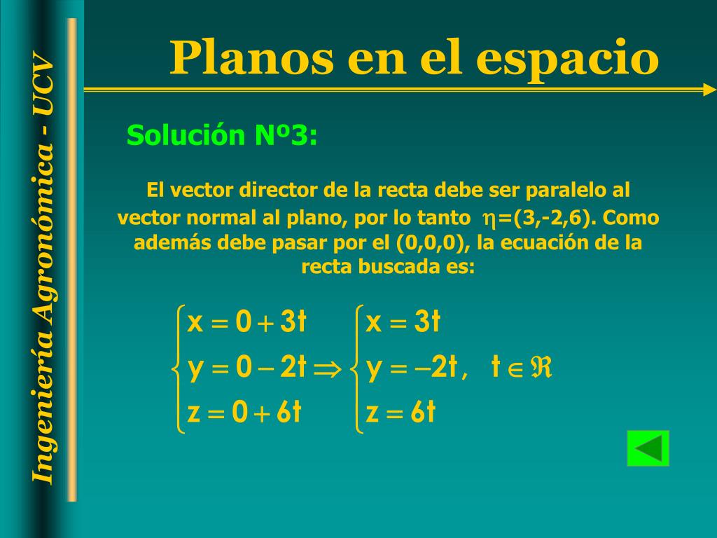 Solución Nº3: El vector director de la recta debe ser paralelo al vector normal al plano, por lo tanto =(3,-2,6). Como además debe pasar por el (0,0,0), la ecuación de la recta buscada es: