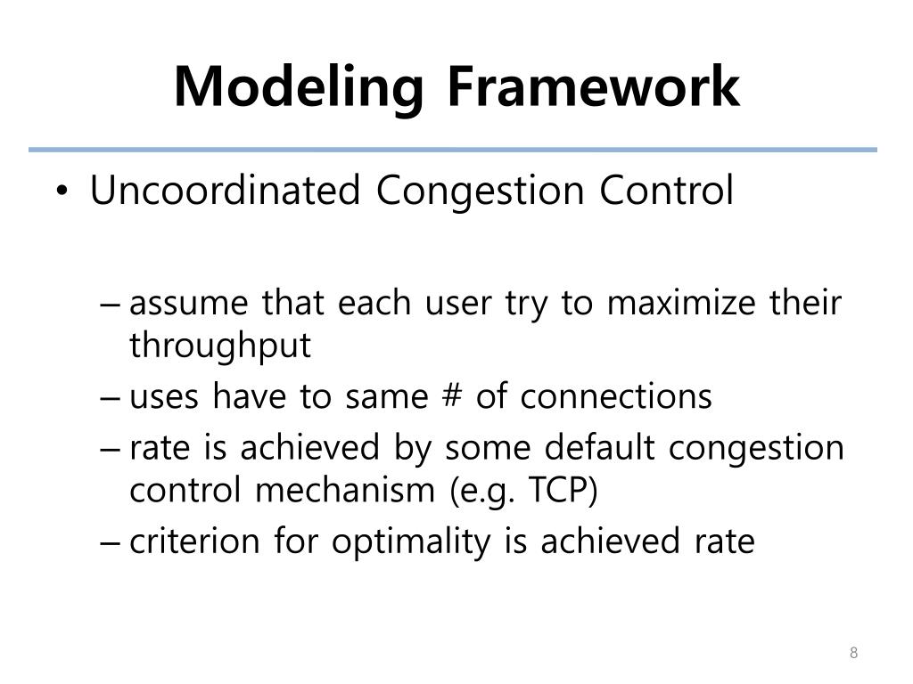 Modeling Framework • Uncoordinated Congestion Control • assume that each user try to maximize their throughput • uses have to same # of connections • rate is achieved by some default congestion control mechanism (e.g. TCP) • criterion for optimality is achieved rate