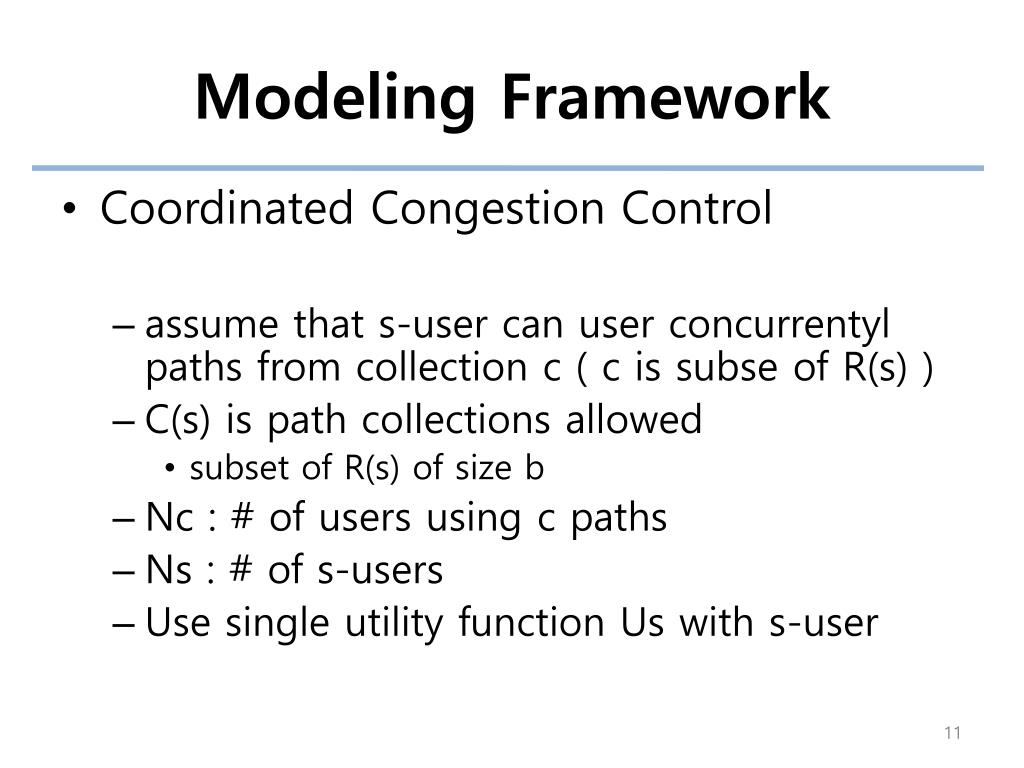 Modeling Framework • Coordinated Congestion Control • assume that s-user can user concurrentyl paths from collection c ( c is subse of R(s) ) • C(s) is path collections allowed • subset of R(s) of size b • Nc : # of users using c paths • Ns : # of s-users • Use single utility function Us with s-user