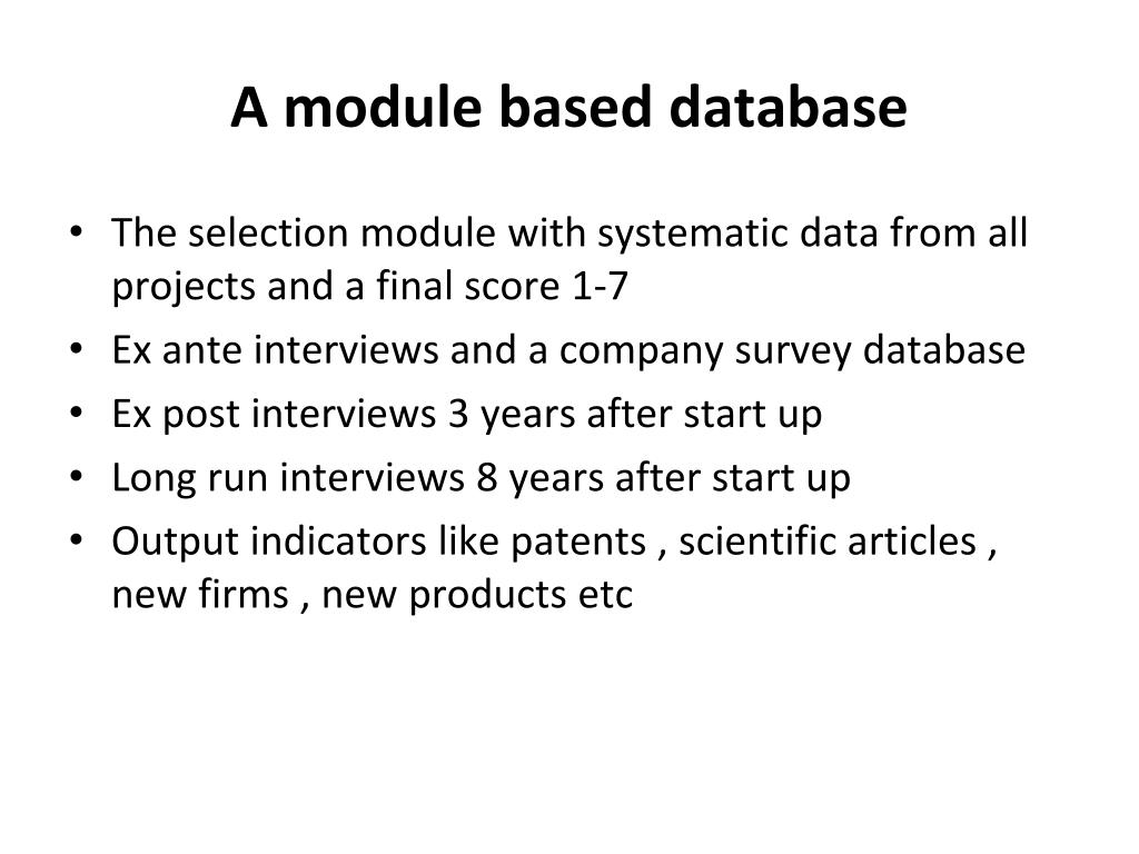 A modulebased database • The selectionmodulewithsystematic data from all projects and a final score 1-7 • Ex ante interviews and a company survey database • Ex post interviews 3 yearsafter start up • Long run interviews 8 yearsafter start up • Output indicators like patents , scientificarticles , newfirms , newproductsetc