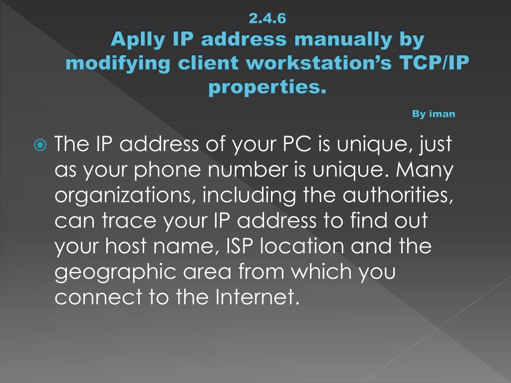 2.4.6Aplly IP address manually by modifying client workstation’s TCP/IP properties. By iman • The IP address of your PC is unique, just as your phone number is unique. Many organizations, including the authorities, can trace your IP address to find out your host name, ISP location and the geographic area from which you connect to the Internet.