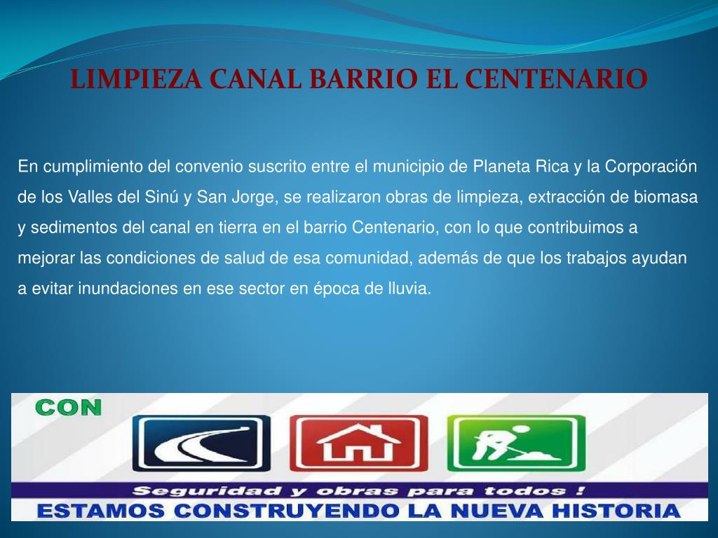 LIMPIEZA CANAL BARRIO EL CENTENARIO En cumplimiento del convenio suscrito entre el municipio de Planeta Rica y la Corporación de los Valles del Sinú y San Jorge, se realizaron obras de limpieza, extracción de biomasa y sedimentos del canal en tierra en el barrio Centenario, con lo que contribuimos a mejorar las condiciones de salud de esa comunidad, además de que los trabajos ayudan a evitar inundaciones en ese sector en época de lluvia.