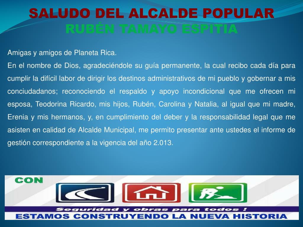 SALUDO DEL ALCALDE POPULAR RUBÉN TAMAYO ESPITIA Amigas y amigos de Planeta Rica. En el nombre de Dios, agradeciéndole su guía permanente, la cual recibo cada día para cumplir la difícil labor de dirigir los destinos administrativos de mi pueblo y gobernar a mis conciudadanos; reconociendo el respaldo y apoyo incondicional que me ofrecen mi esposa, Teodorina Ricardo, mis hijos, Rubén, Carolina y Natalia, al igual que mi madre, Erenia y mis hermanos, y, en cumplimiento del deber y la responsabilidad legalque me asisten en calidad de Alcalde Municipal, me permito presentar ante ustedes el informe de gestión correspondiente a la vigencia del año 2.013.