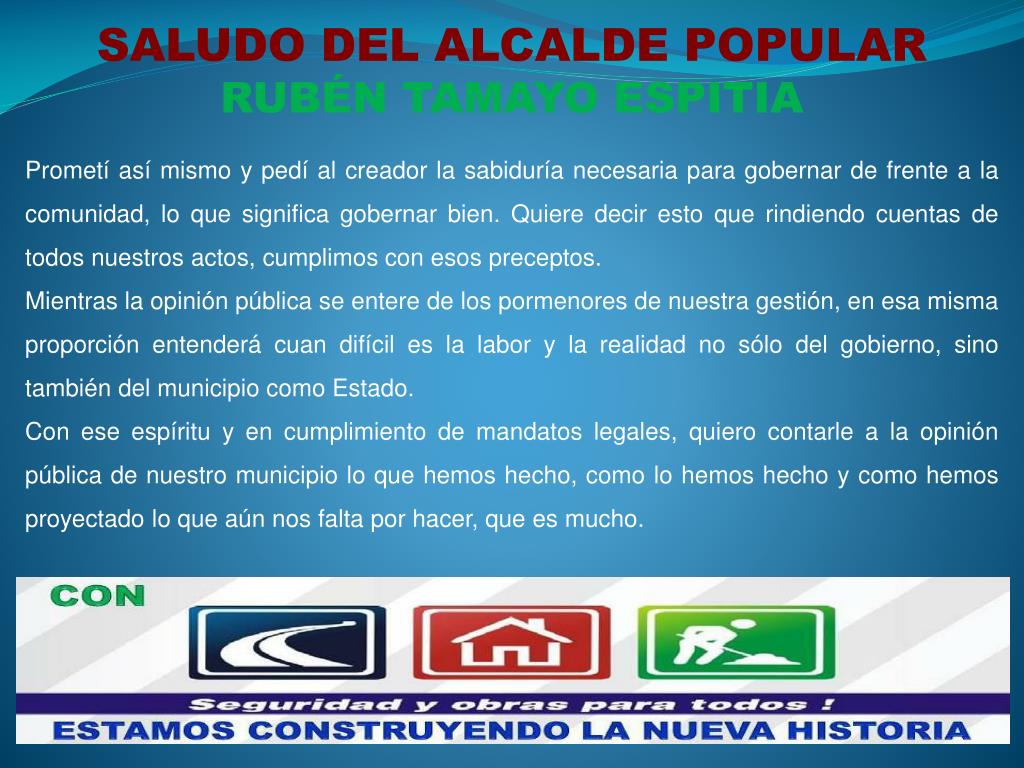 SALUDO DEL ALCALDE POPULAR RUBÉN TAMAYO ESPITIA Prometí así mismo y pedí al creador la sabiduría necesaria para gobernar de frente a la comunidad, lo que significa gobernar bien. Quiere decir esto que rindiendo cuentas de todos nuestros actos, cumplimos con esos preceptos. Mientras la opinión pública se entere de los pormenores de nuestra gestión, en esa misma proporción entenderá cuan difícil es la labor y la realidad no sólo del gobierno, sino también del municipio como Estado. Con ese espíritu y en cumplimiento de mandatos legales, quiero contarle a la opinión pública de nuestro municipio lo que hemos hecho, como lo hemos hecho y como hemos proyectado lo que aún nos falta por hacer, que es mucho.