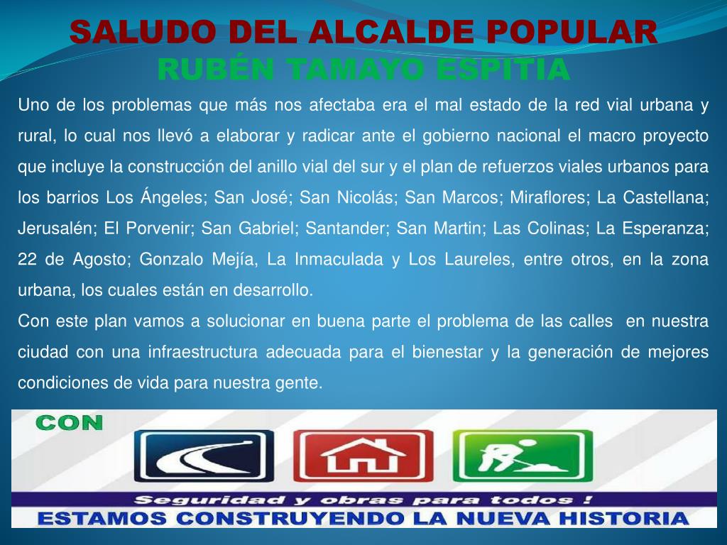 SALUDO DEL ALCALDE POPULAR RUBÉN TAMAYO ESPITIA Uno de los problemas que más nos afectaba era el mal estado de la red vial urbana y rural, lo cual nos llevó a elaborar y radicar ante el gobierno nacional el macro proyecto que incluye la construcción del anillo vial del sur y el plan de refuerzos viales urbanos para los barrios Los Ángeles; San José; San Nicolás; San Marcos; Miraflores; La Castellana; Jerusalén; El Porvenir; San Gabriel; Santander; San Martin; Las Colinas; La Esperanza; 22 de Agosto; Gonzalo Mejía, La Inmaculada y Los Laureles, entre otros, en la zona urbana, los cuales están en desarrollo. Con este plan vamos a solucionar en buena parte el problema de las calles en nuestra ciudad con una infraestructura adecuada para el bienestar y la generación de mejores condiciones de vida para nuestra gente.