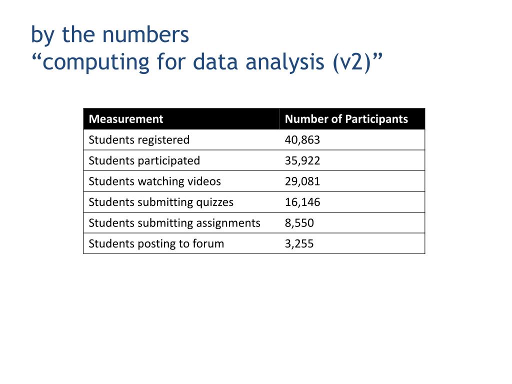 the day after that from: jtleek@gmail.com Roger let me know you gave him a ballpark figure for the number of students registered for his course "Computing for Data Analysis”. Could you give me an idea of how many have registered for my course "Data Analysis?”