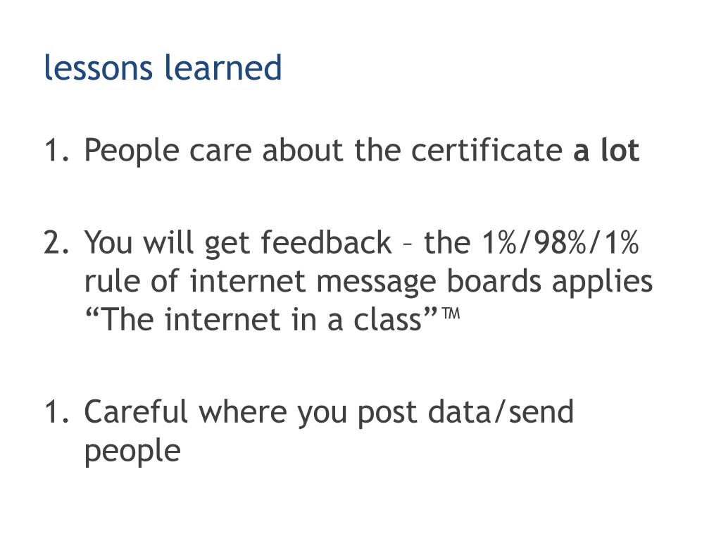 lessons learned • People care about the certificate a lot • You will get feedback – the 1%/98%/1% rule of internet message boards applies “The internet in a class”™ • Careful where you post data/send people