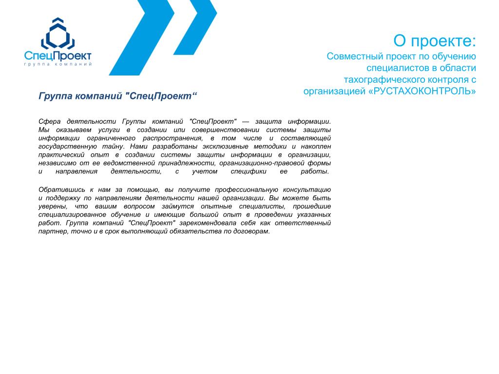 Обучение специалистов 201 3 Совместный проект с организацией «РУСТАХОКОНТРОЛЬ». О проекте: Совместный проект по обучению специалистов в области тахографического контроля с организацией «РУСТАХОКОНТРОЛЬ». Группа компаний "СпецПроект“
