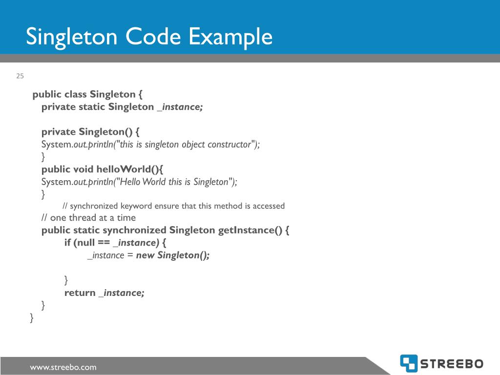 Singleton Code Example public class Singleton { private static Singleton _instance; private Singleton() { System.out.println("this is singleton object constructor"); } public void helloWorld(){ System.out.println("Hello World this is Singleton"); } // synchronized keyword ensure that this method is accessed // one thread at a time public static synchronized Singleton getInstance() { if (null == _instance) { _instance = new Singleton(); } return _instance; } }