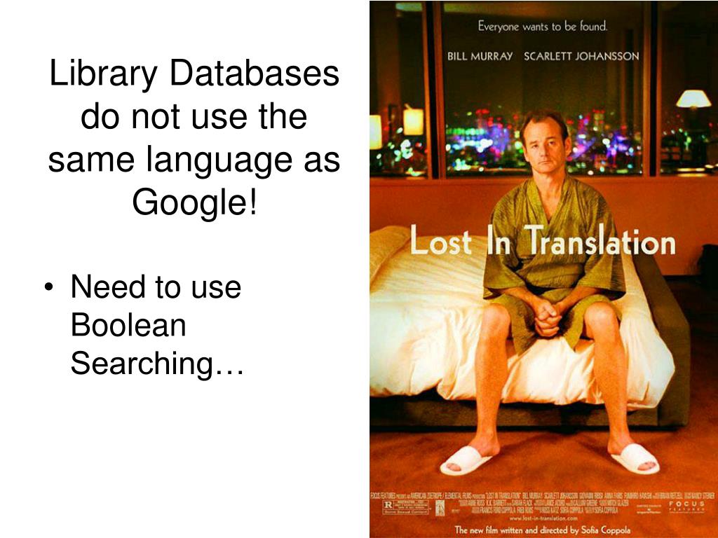 Library Databases do not use the same language as Google! • Need to use Boolean Searching…