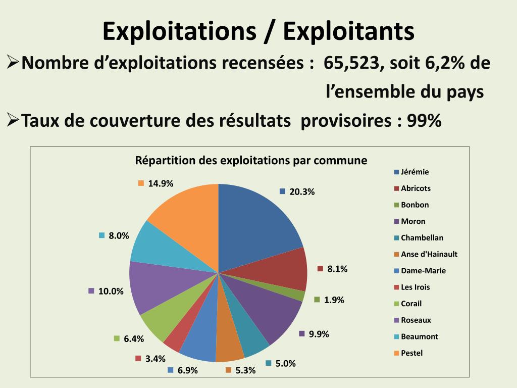 Exploitations / Exploitants Nombre d’exploitations recensées : 65,523, soit 6,2% de l’ensemble du pays Taux de couverture des résultats provisoires : 99%