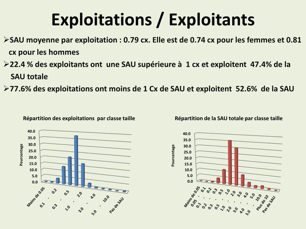 Exploitations / Exploitants SAU moyenne par exploitation : 0.79 cx. Elle est de 0.74 cx pour les femmes et 0.81 cx pour les hommes 22.4 % des exploitants ont une SAU supérieure à 1 cx et exploitent 47.4% de la SAU totale 77.6% des exploitations ont moins de 1 Cx de SAU et exploitent 52.6% de la SAU Répartition des exploitations par classe taille Répartition de la SAU totale par classe taille