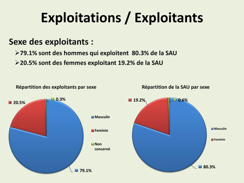 Exploitations / Exploitants Sexe des exploitants : 79.1% sont des hommes qui exploitent 80.3% de la SAU 20.5% sont des femmes exploitant 19.2% de la SAU Répartition des exploitants par sexe Répartition de la SAU par sexe