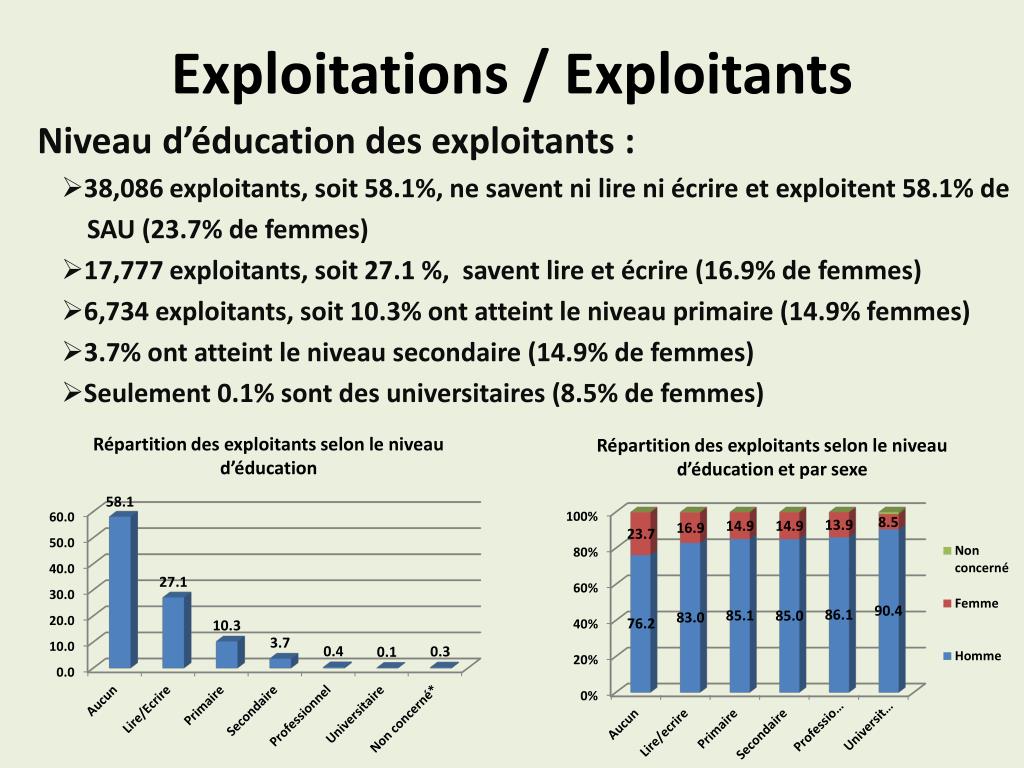 Exploitations / Exploitants Répartition des exploitants selon le niveau d’éducation Répartition des exploitants selon le niveau d’éducation et par sexe Niveau d’éducation des exploitants : 38,086 exploitants, soit 58.1%, ne savent ni lire ni écrire et exploitent 58.1% de SAU (23.7% de femmes) 17,777 exploitants, soit 27.1 %, savent lire et écrire (16.9% de femmes) 6,734 exploitants, soit 10.3% ont atteint le niveau primaire (14.9% femmes) 3.7% ont atteint le niveau secondaire (14.9% de femmes) Seulement 0.1% sont des universitaires (8.5% de femmes)