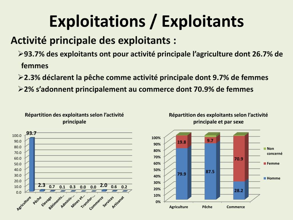 Exploitations / Exploitants Répartition des exploitants selon l’activité principale Répartition des exploitants selon l’activité principale et par sexe Activité principale des exploitants : 93.7% des exploitants ont pour activité principale l’agriculture dont 26.7% de femmes 2.3% déclarent la pêche comme activité principale dont 9.7% de femmes 2% s’adonnent principalement au commerce dont 70.9% de femmes