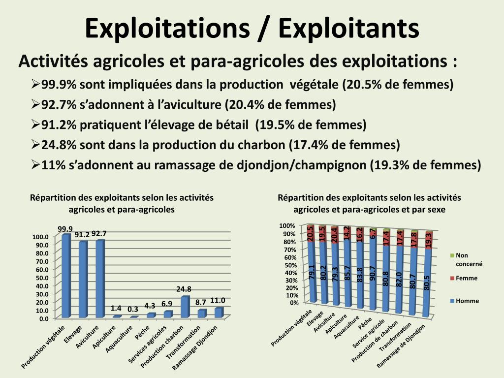 Exploitations / Exploitants Répartition des exploitants selon les activités agricoles et para-agricoles Répartition des exploitants selon les activités agricoles et para-agricoles et par sexe Activités agricoles et para-agricoles des exploitations : 99.9% sont impliquées dans la production végétale (20.5% de femmes) 92.7% s’adonnent à l’aviculture (20.4% de femmes) 91.2% pratiquent l’élevage de bétail (19.5% de femmes) 24.8% sont dans la production du charbon (17.4% de femmes) 11% s’adonnent au ramassage de djondjon/champignon (19.3% de femmes)