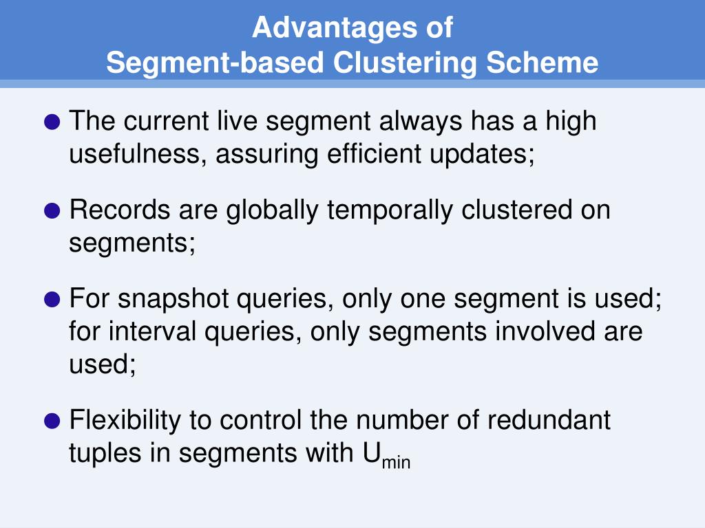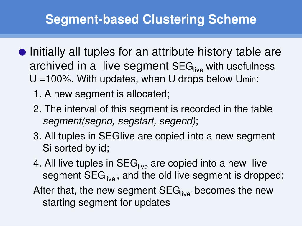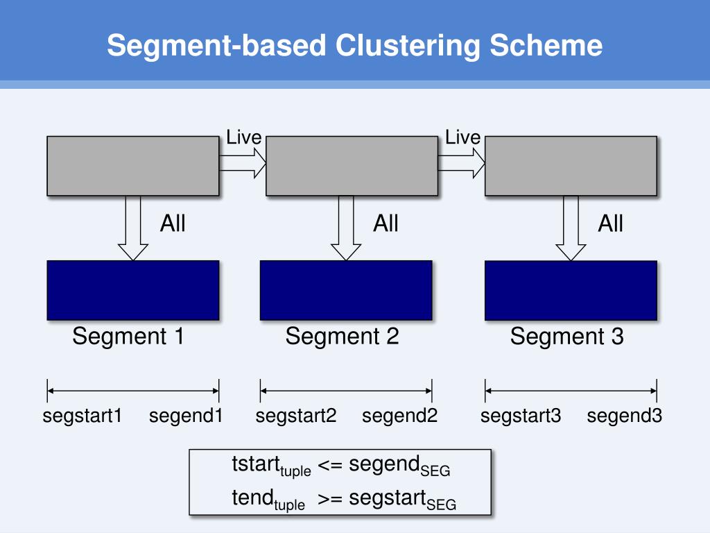 Segment-based Clustering Scheme Live Live All All All Segment 1 Segment 2 Segment 3 segstart1 segstart2 segstart3 segend1 segend2 segend3 tstarttuple <= segendSEG tendtuple >= segstartSEG