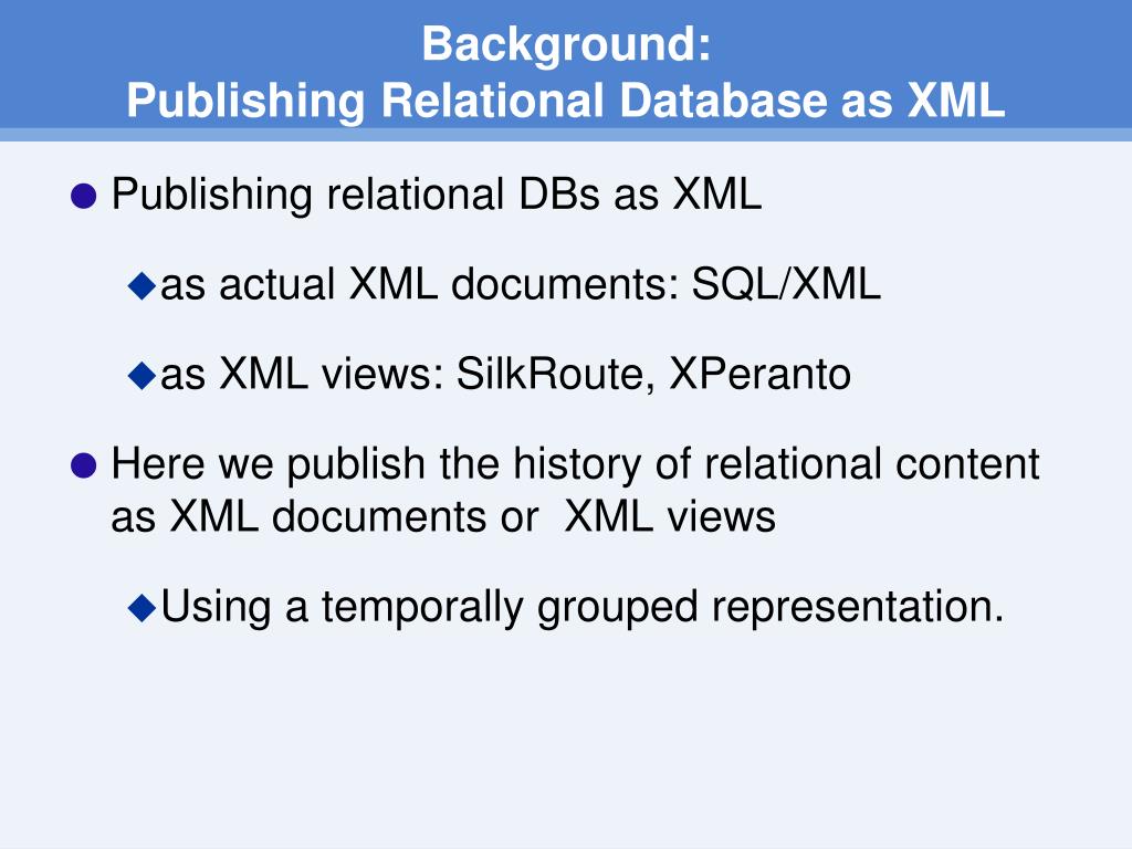 Background: Publishing Relational Database as XML • Publishing relational DBs as XML • as actual XML documents: SQL/XML • as XML views: SilkRoute, XPeranto • Here we publish the history of relational content as XML documents or XML views • Using a temporally grouped representation.