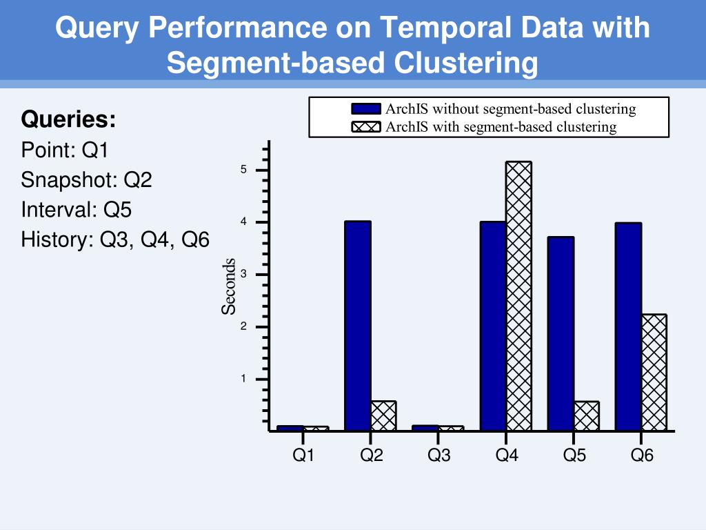 Query Performance on Temporal Data with Segment-based Clustering Queries: Point: Q1 Snapshot: Q2 Interval: Q5 History: Q3, Q4, Q6