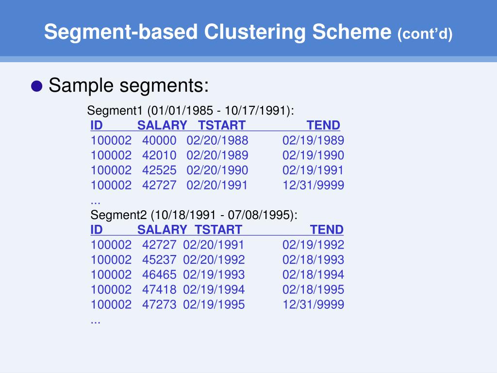 Segment-based Clustering Scheme (cont’d) • Sample segments: Segment1 (01/01/1985 - 10/17/1991): ID SALARY TSTART TEND 100002 40000 02/20/1988 02/19/1989 100002 42010 02/20/1989 02/19/1990 100002 42525 02/20/1990 02/19/1991 100002 42727 02/20/1991 12/31/9999 ... Segment2 (10/18/1991 - 07/08/1995): ID SALARY TSTART TEND 100002 42727 02/20/1991 02/19/1992 100002 45237 02/20/1992 02/18/1993 100002 46465 02/19/1993 02/18/1994 100002 47418 02/19/1994 02/18/1995 100002 47273 02/19/1995 12/31/9999 ...