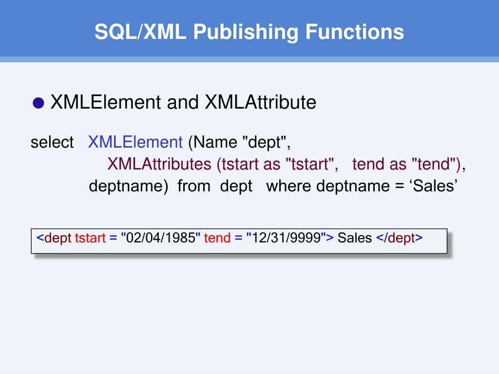 SQL/XML Publishing Functions • XMLElement and XMLAttribute select XMLElement (Name "dept", XMLAttributes (tstart as "tstart", tend as "tend"), deptname) from dept where deptname = ‘Sales’ <dept tstart ="02/04/1985" tend ="12/31/9999"> Sales </dept>
