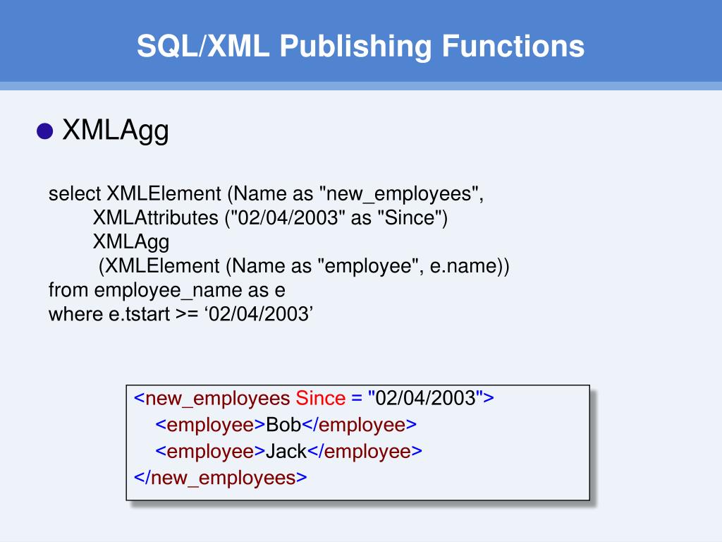 SQL/XML Publishing Functions • XMLAgg select XMLElement (Name as "new_employees", XMLAttributes ("02/04/2003" as "Since") XMLAgg (XMLElement (Name as "employee", e.name)) from employee_name as e where e.tstart >= ‘02/04/2003’ <new_employees Since ="02/04/2003"> <employee>Bob</employee> <employee>Jack</employee> </new_employees>