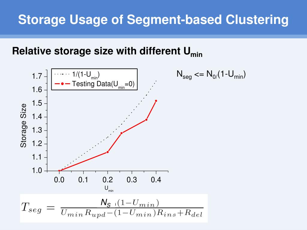 Storage Usage of Segment-based Clustering Relative storage size with different Umin Nseg <= N0/(1-Umin) NS