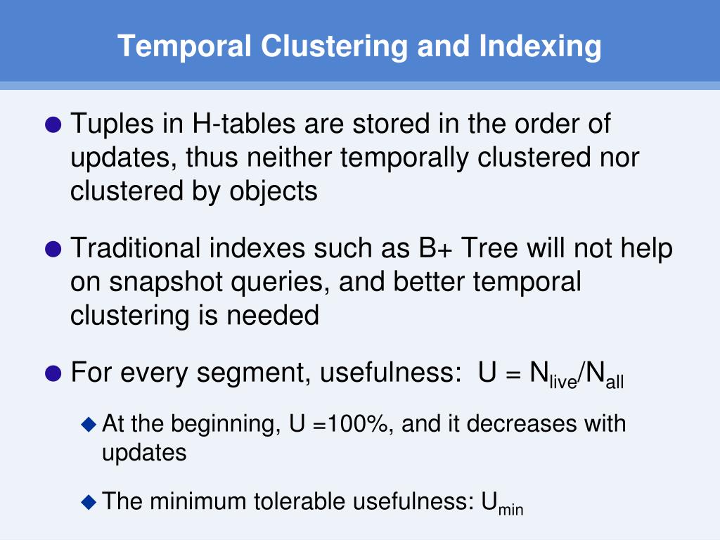 Temporal Clustering and Indexing • Tuples in H-tables are stored in the order of updates, thus neither temporally clustered nor clustered by objects • Traditional indexes such as B+ Tree will not help on snapshot queries, and better temporal clustering is needed • For every segment, usefulness: U = Nlive/Nall • At the beginning, U =100%, and it decreases with updates • The minimum tolerable usefulness: Umin