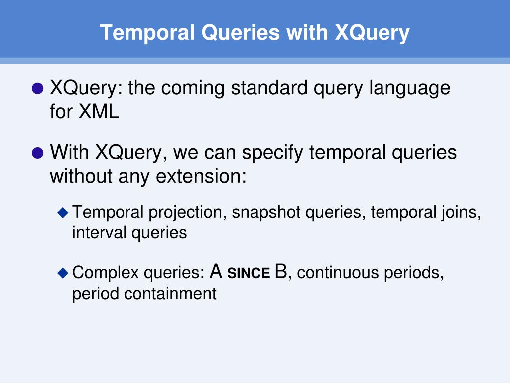 Temporal Queries with XQuery • XQuery: the coming standard query language for XML • With XQuery, we can specify temporal queries without any extension: • Temporal projection, snapshot queries, temporal joins, interval queries • Complex queries: ASINCE B, continuous periods, period containment