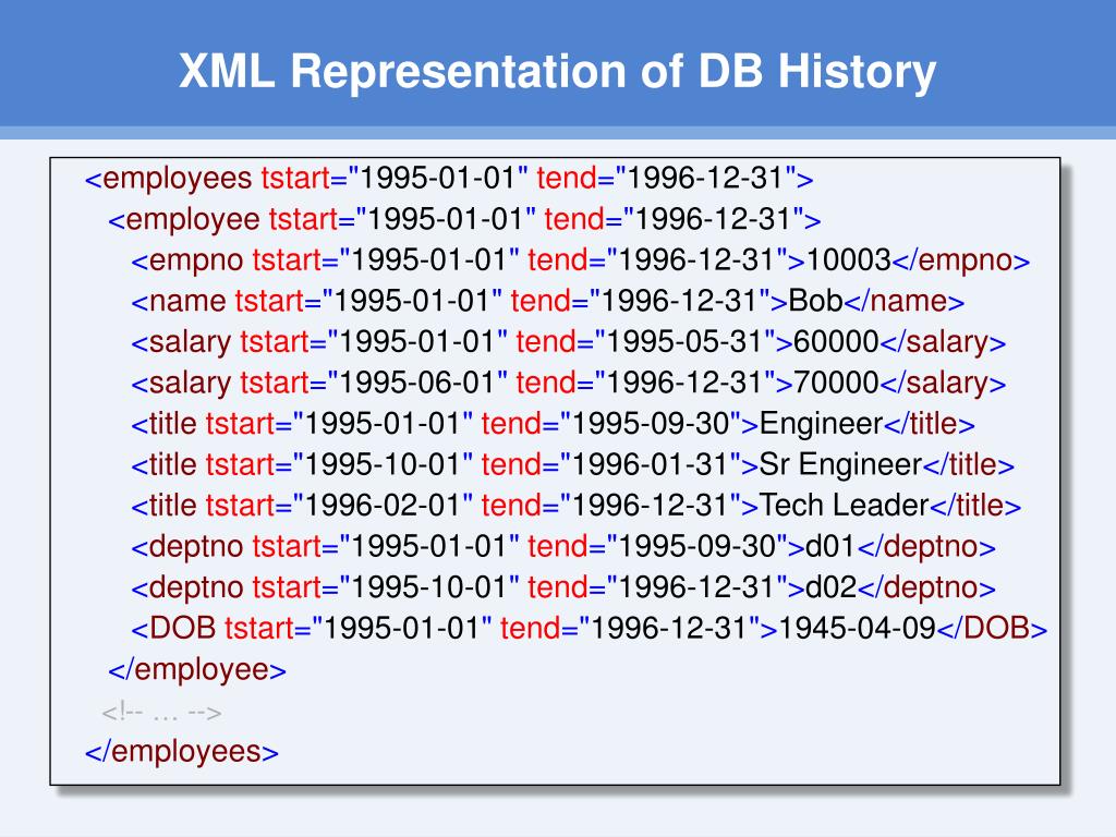 XML Representation of DB History <employees tstart="1995-01-01" tend="1996-12-31"> <employee tstart="1995-01-01" tend="1996-12-31"> <empno tstart="1995-01-01" tend="1996-12-31">10003</empno> <name tstart="1995-01-01" tend="1996-12-31">Bob</name> <salary tstart="1995-01-01" tend="1995-05-31">60000</salary> <salary tstart="1995-06-01" tend="1996-12-31">70000</salary> <title tstart="1995-01-01" tend="1995-09-30">Engineer</title> <title tstart="1995-10-01" tend="1996-01-31">Sr Engineer</title> <title tstart="1996-02-01" tend="1996-12-31">Tech Leader</title> <deptno tstart="1995-01-01" tend="1995-09-30">d01</deptno> <deptno tstart="1995-10-01" tend="1996-12-31">d02</deptno> <DOB tstart="1995-01-01" tend="1996-12-31">1945-04-09</DOB> </employee> <!-- … --> </employees>