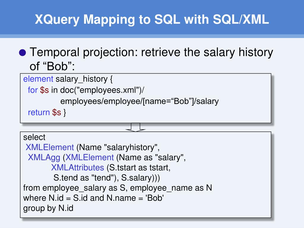 XQuery Mapping to SQL with SQL/XML • Temporal projection: retrieve the salary history of “Bob”: element salary_history { for$s in doc("employees.xml")/ employees/employee/[name=“Bob”]/salary return$s } select XMLElement (Name "salaryhistory", XMLAgg (XMLElement (Name as "salary", XMLAttributes (S.tstart as tstart, S.tend as "tend"), S.salary))) from employee_salary as S, employee_name as N where N.id = S.id and N.name = 'Bob' group by N.id
